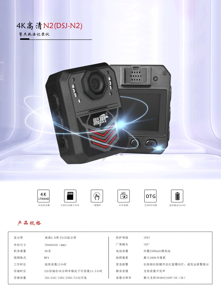 产品名称 : 警杰DSJ-N2执法视音频记录仪 64G