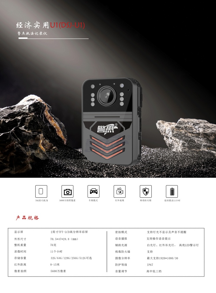 产品名称 : 警杰DSJ-U1执法视音频记录仪64G
